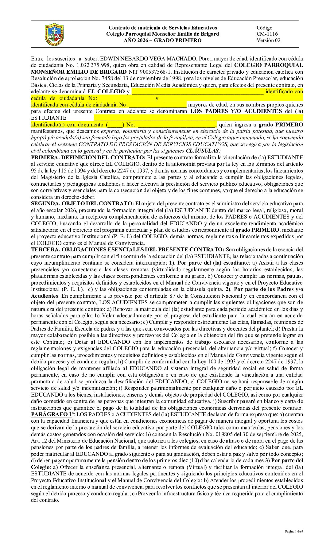 CONTRATO MATRICULA 2026 - GRADO PRIMERO